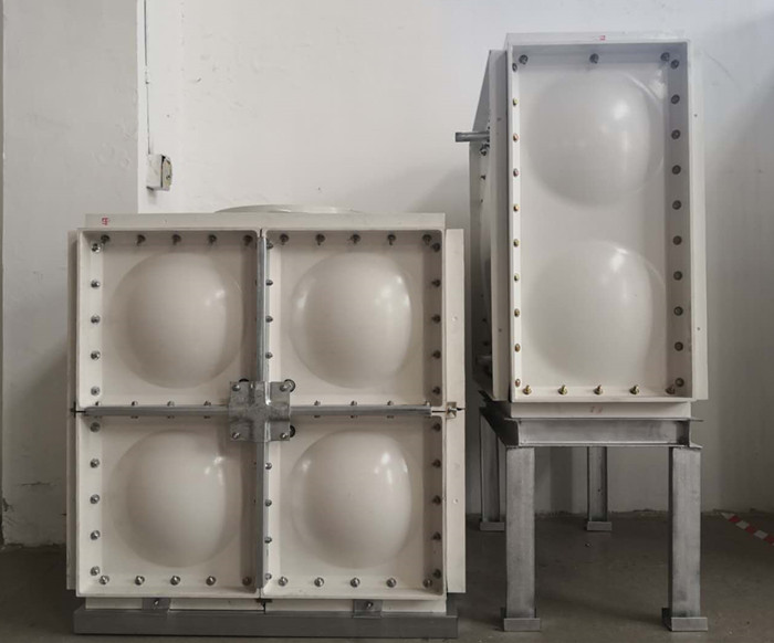 玻璃鋼水箱是由SMC模壓?jiǎn)伟?、密封材料、金屬結(jié)構(gòu)件及配管系統(tǒng)組合拼裝而成。可以根據(jù)用戶(hù)需要組裝1-1000立方的水箱。模壓?jiǎn)伟迨遣捎貌伙柡蜆?shù)脂生產(chǎn)的SMC片材,經(jīng)高溫、高壓、機(jī)械壓制而成。在制造工藝上,采取機(jī)壓成型的制作方法。增加了抗震、抗沖擊的強(qiáng)度、克服了手糊制品強(qiáng)度不均勻的缺陷,提高了耐壓強(qiáng)度和使用壽命;在外型設(shè)計(jì)上,板塊中部呈凹陷弧度,提高了水箱的承壓能力,同時(shí)板塊四周沒(méi)有45度和90度的凸緣,組裝時(shí)不用邊角連接件,更具有柔韌性和靈活性,水箱密封是采用專(zhuān)業(yè)的定型產(chǎn)品-密封帶,該密封帶、耐水、彈性大、變形小,使用壽命長(zhǎng)。